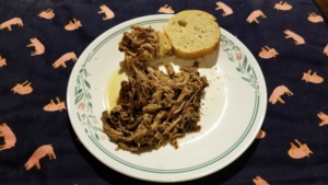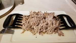 After pulled, I threw shredded pork back in slow cooker and tossed in sauce, let sit for about 15 minutes. It was delicious. Served on sour dough bread.