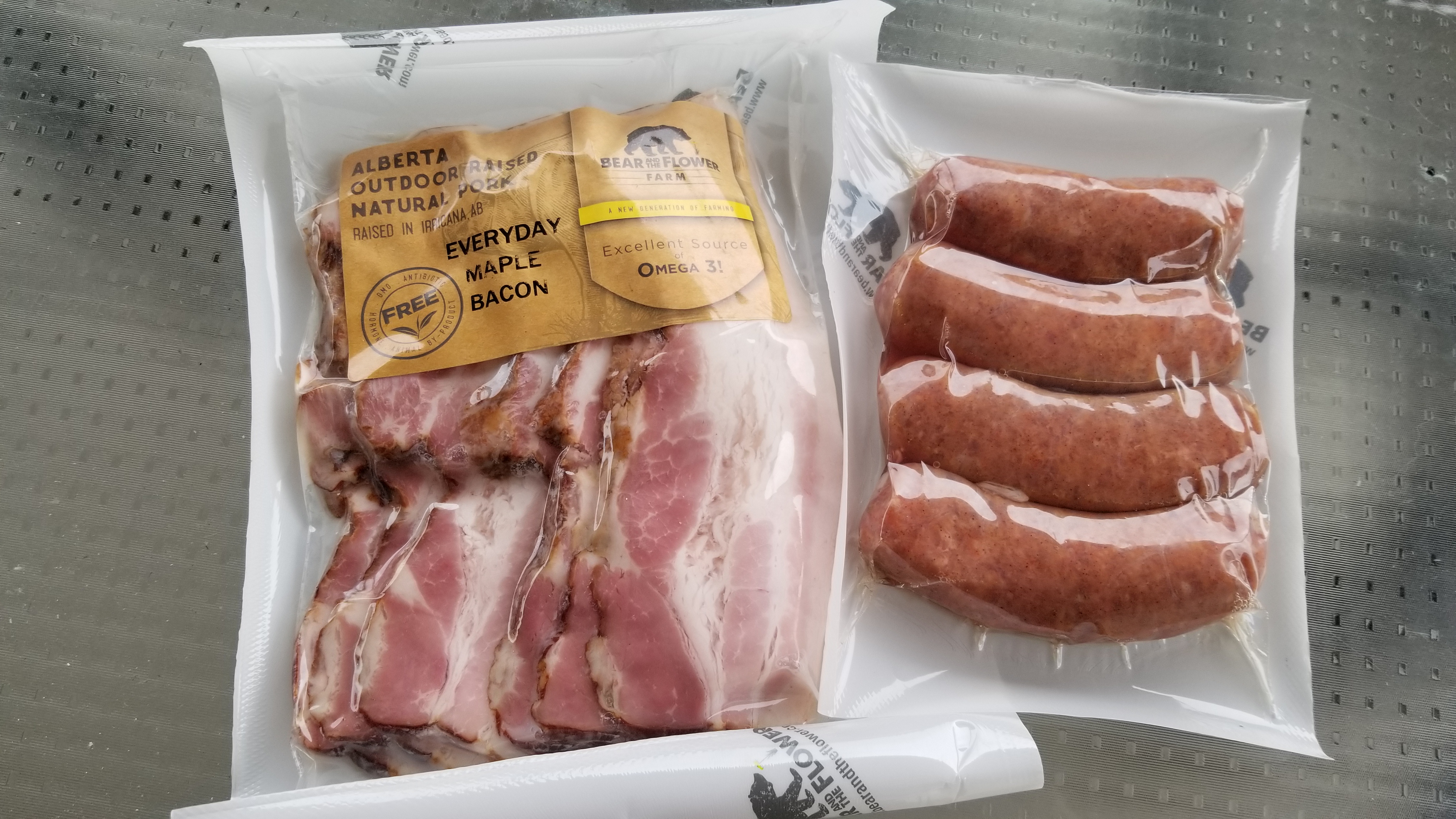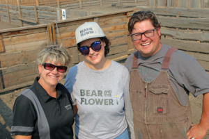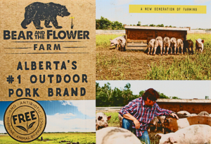 demand for their pork growing steadily. Working with a conventional swine breeder, they started tailoring their stock to produce hardy pigs that had the right genetics to produce nicely-coloured, flavourful cuts. While they started with a mix of Landrace, Berkshire and Duroc lines, they later dropped the Berkshire in favour of Large Whites because of the larger carcass. Bear and the Flower Farm has a major customer who specializes in larger cuts, so likes to see the pigs dress out at 225 pounds with the head removed.