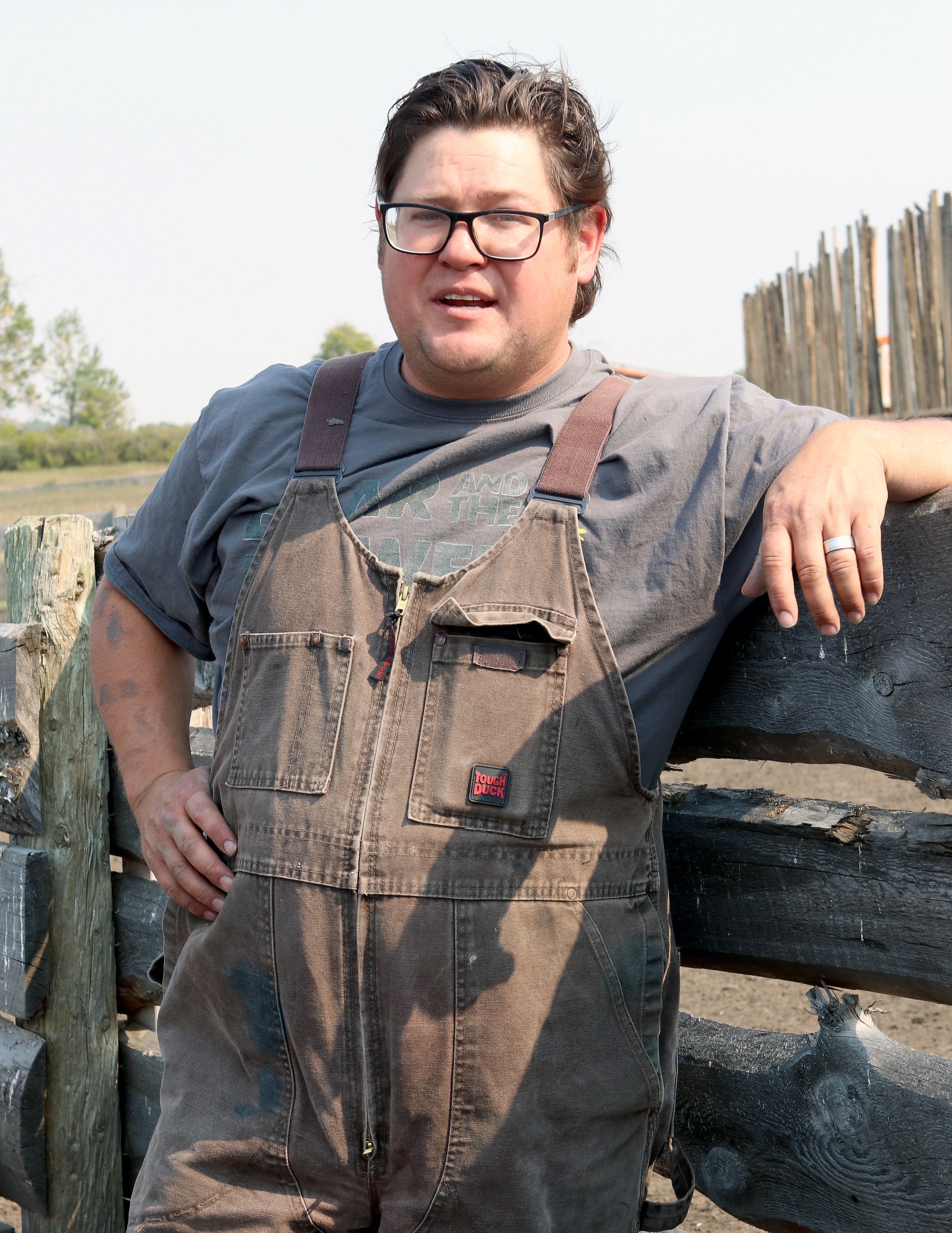 Leaning against a fence, watching a raven peering down at his pigs, Chris