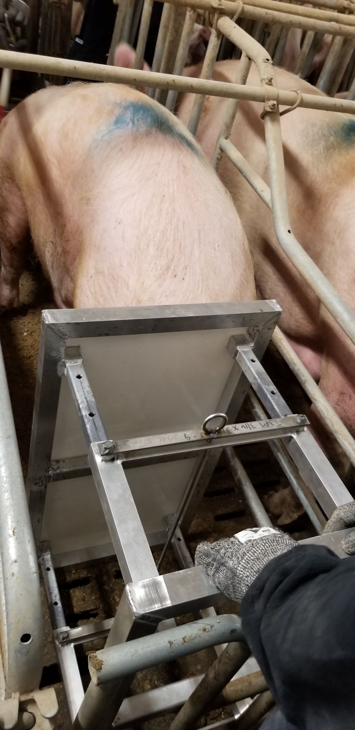 Concerned for the safety of sows and staff during the difficult taking blood samples, White and her team developed a spacer that can be placed behind the animal to restrain her during the process. The Backspacer Device is made of an aluminum tubing, stainless steel and puck board at a cost of about $290 per unit, including materials and labour.