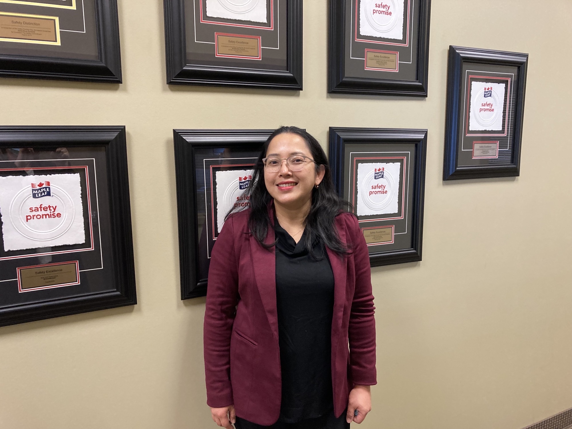 The F.X. Aherne award was presented virtually to Veterinarian Jewel White, senior manager of animal health for Maple Leaf Agrifarms.