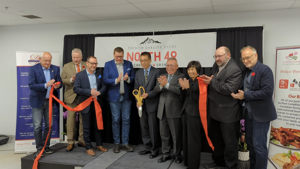 Allan Leung, CEO of North 49’s parent company Donald’s Fine Foods, and Saskatchewan Premier Scott Moe cut the ribbon jointly following remarks by Leung, Moe, provincial Minister of Agriculture David Marit, Moose Jaw Mayor Clive Tolley, Director-General of PrairiesCan Doug Zolinsky, MP Fraser Tolmie, and Toby Tschetter, board chair of the Saskatchewan Pork Development Board.