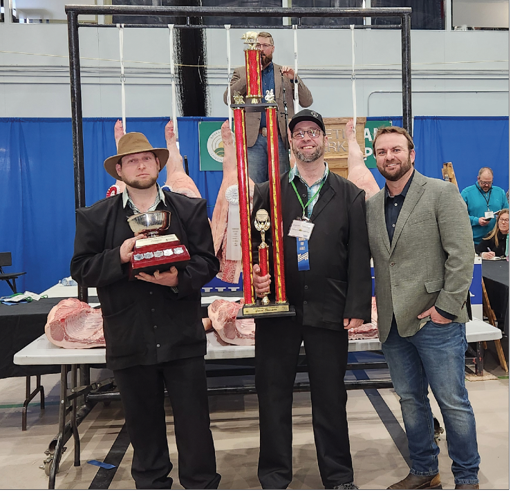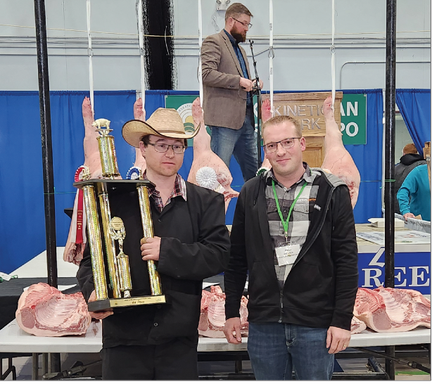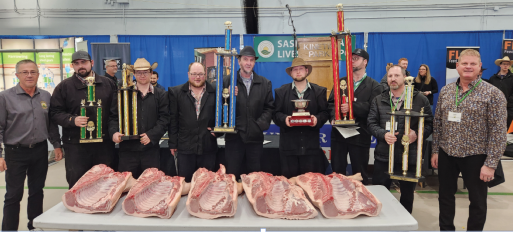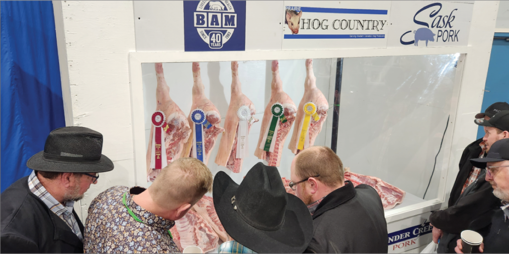 Jason Care, Manitoba Hog Grading, performed even trickery job in his seventh year of judging in Swift Current. Using the Thunder Creek 2020 Grid, points were awarded by this criteria: Carcass weight, Carcass Index, Back Fat, Marbling Bonus, Loin Eye Colour, Loin Eye Measurement and Belly – a perfect score would be 111 points. There were 34 hogs entered into the Pork Quality Competition. Thanks to Thunder Creek for processing the meat, as Kaye Kronebusch, Hog Procurement Specialist Donald’s Fine Foods (Thunder Creek) shared with Prairie Hog Country that 7535 lbs. of pork processed is made into primal cuts for the various food banks.
