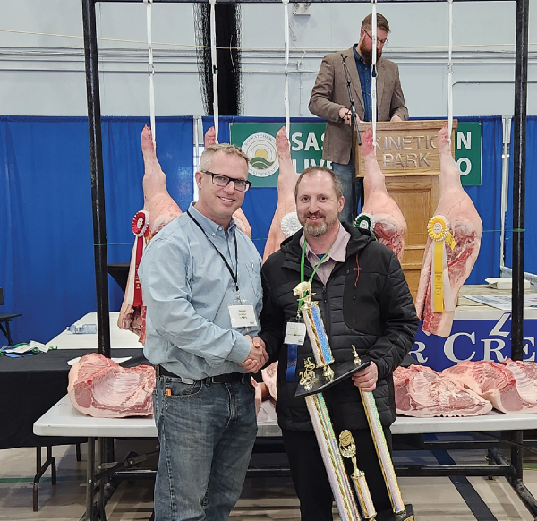 First place hog from Wymark sold to WAGS for $ 3250, donation to Allan Blair Cancer Centre. Second place hog from Sand Lake sold to Fortified Nutrition for $6500 donated to Val Marie Ambulance Service. Third place hog from Downie Lake was sold to Sollio Ag for $2100 donated to Maple Creek Hospital. Forth place hog from Beechy was sold to Nutrition Partners for $3400 donated to STARS. Fifth place hog by Ponteix was sold to Sollio Ag for $2100 donated to STARS.